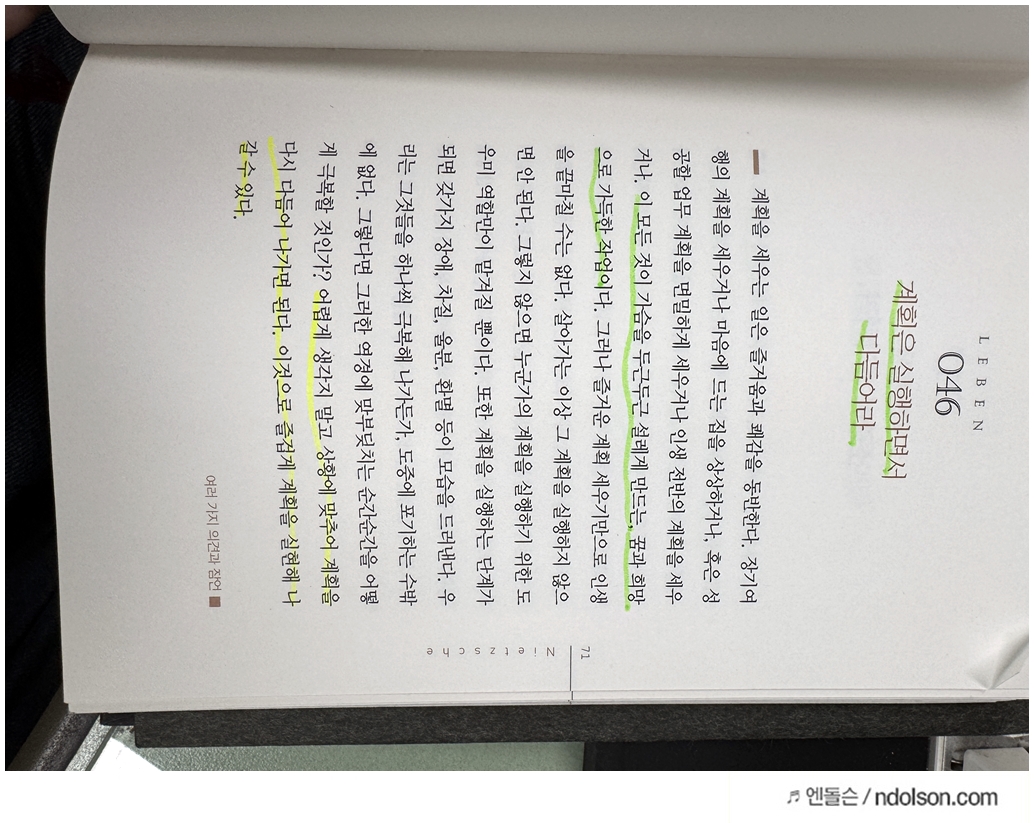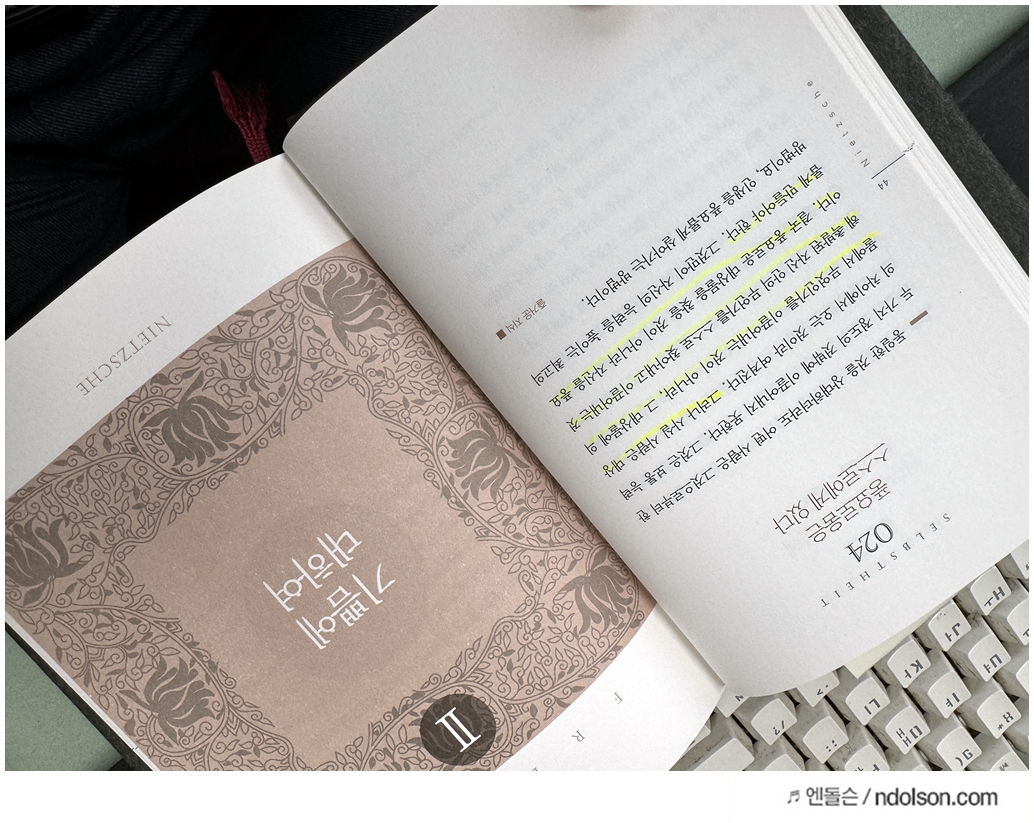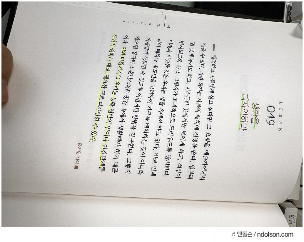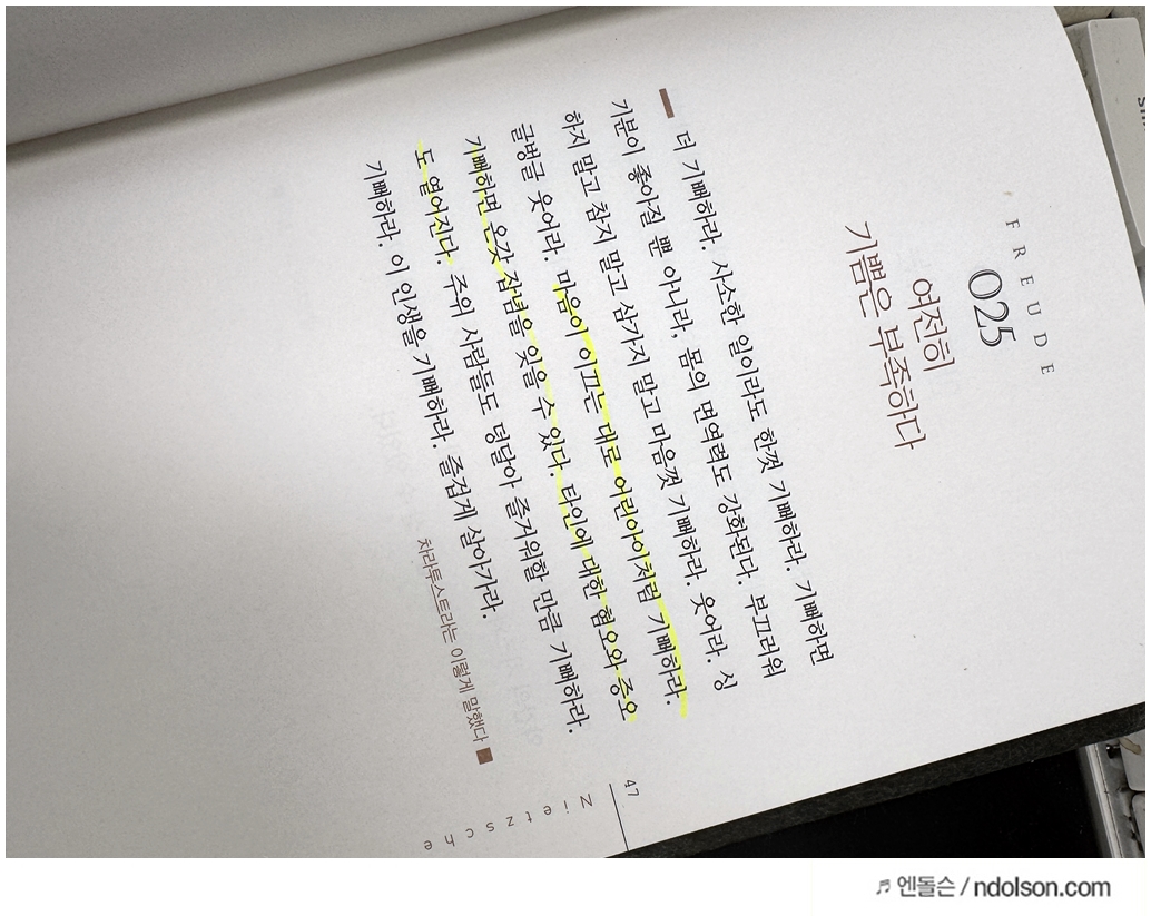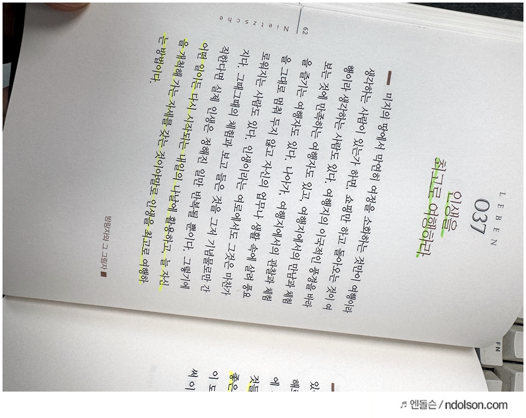 니체의 생각 책을 읽으면서 의미가 있는 부분에 습관적으로 형광색으로 줄을 쳐두었습니다.