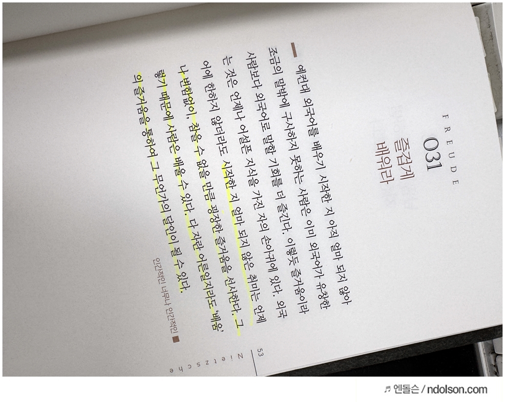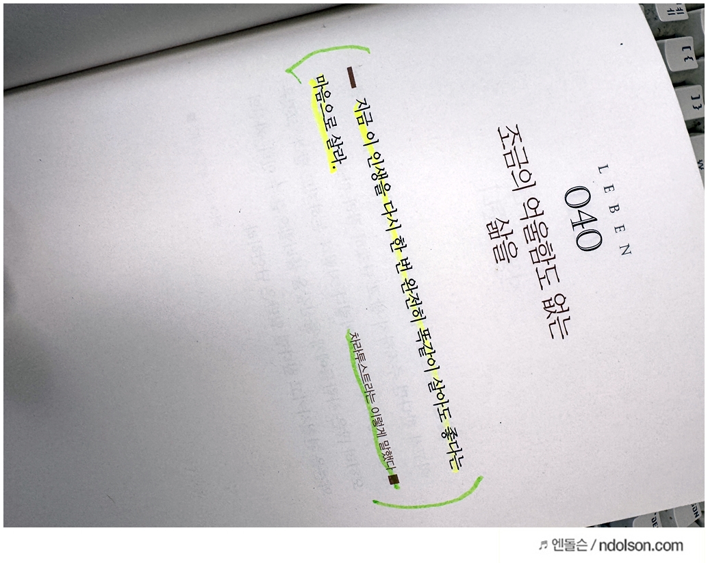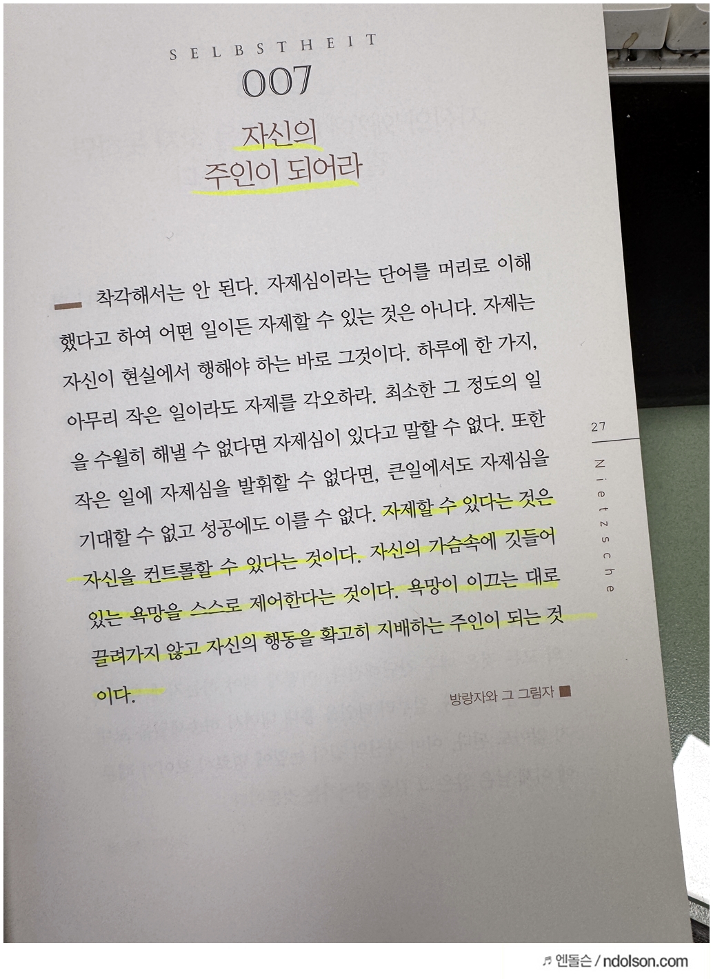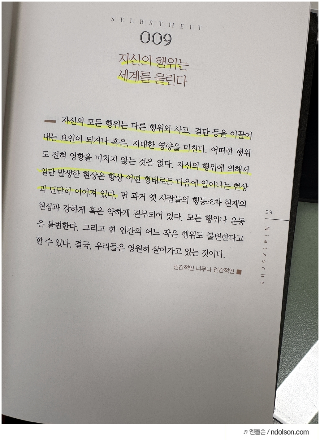 니체의 생각 책을 읽으면서 의미가 있는 부분에 습관적으로 형광색으로 줄을 쳐두었습니다.