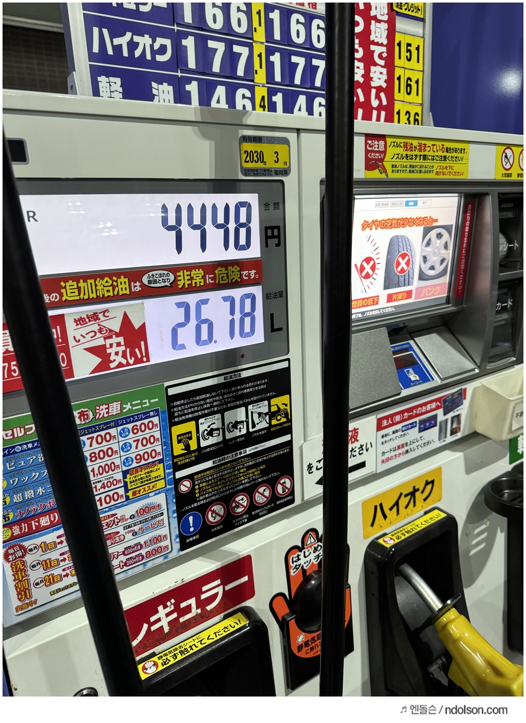 2일간의 덴진에서 시내주행 및 아프리칸 사파리, 지옥온천 등 다녀오면서 4448 엔화(약 3만8천원)의 주유비가 발생하였습니다. 생각보다는 연비가 좋더라고요.