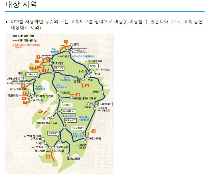 KEP는 규슈 지역의 고속도로를 정액제로 이용할 수 있는 패스입니다. 하루에 일정 금액을 지불하면, 규슈 지역의 모든 고속도로를 마음껏 이용할 수 있습니다. 저희는 2일 요금제인 3600엔을 이용했습니다.