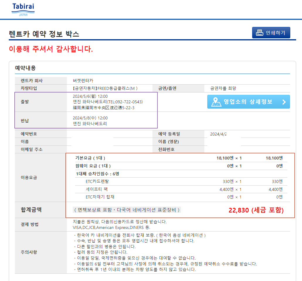 후쿠오카 렌트카 합계금액 (세금 포함 비용)