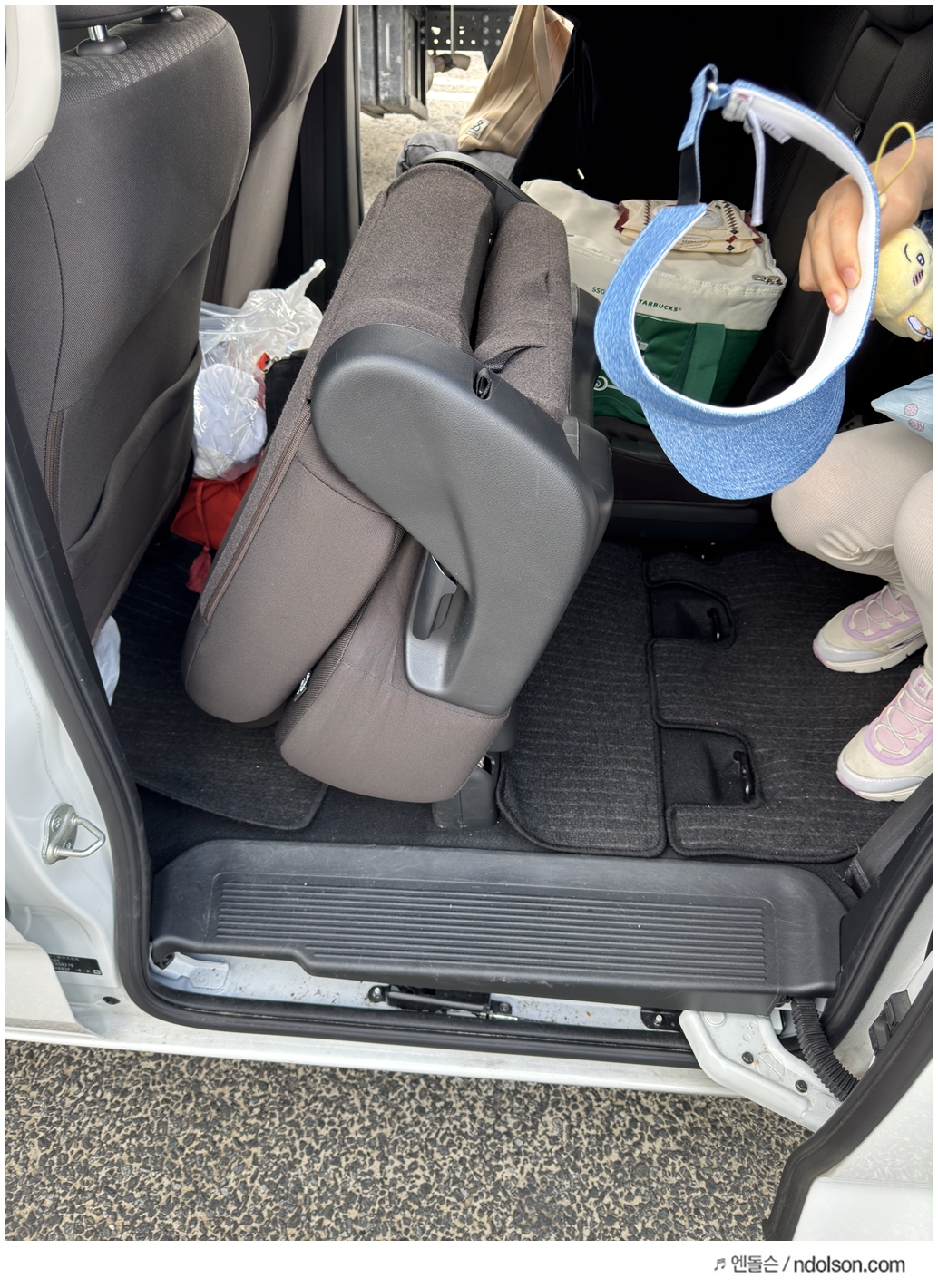 그리고 들어가서는 작은 의자를 세워야 안쪽 트렁크 쪽 의자로 이동할 수 있습니다. 이것도 자동 레버입니다.
