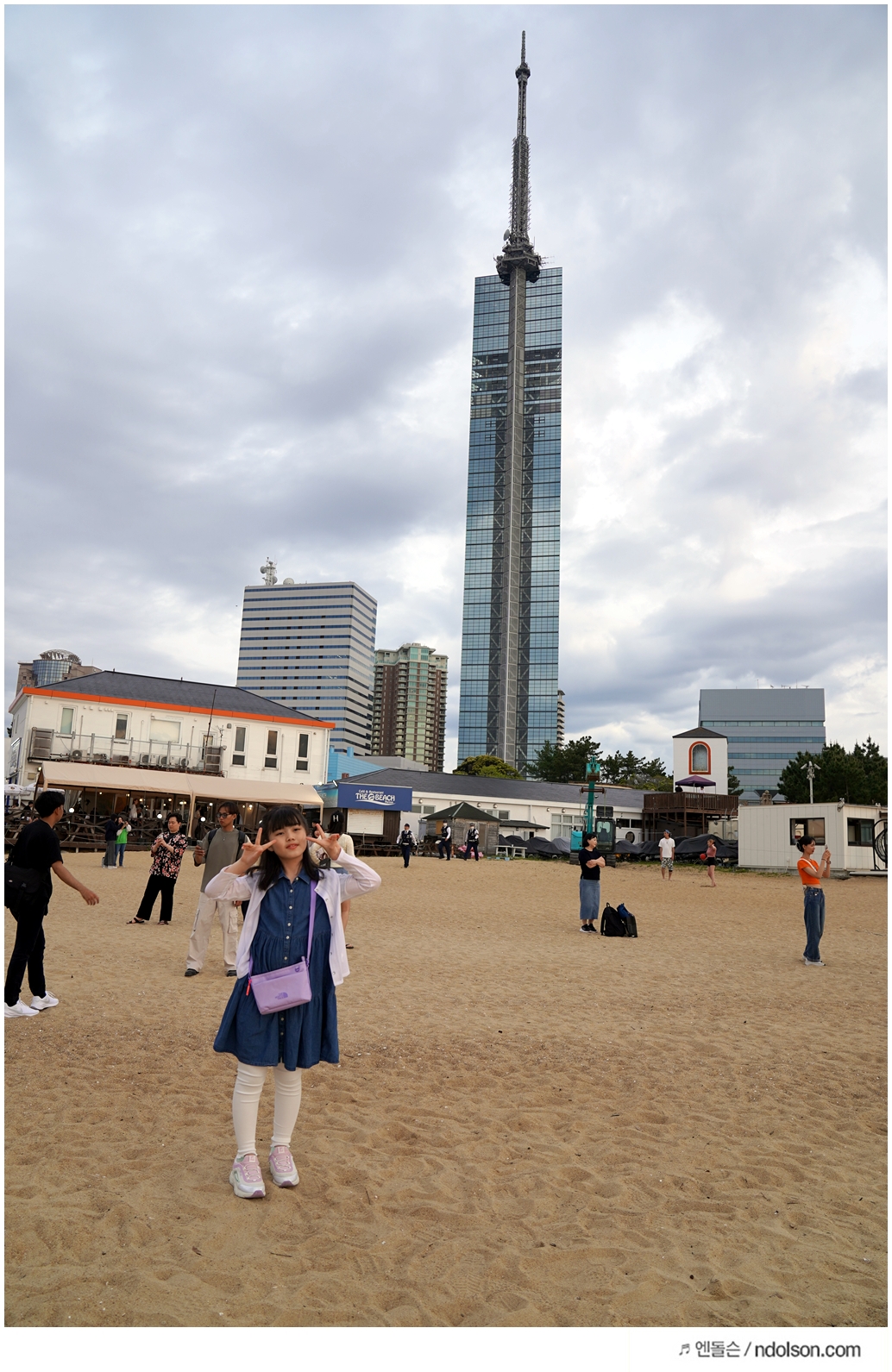 해변 주위에는 간단하게 먹을 음식들이 있는 가게들이 있었고, 그 옆에는 잠시 앉아 쉴 수 있는 벤치도 있었습니다. 저희는 벤치에 앉아서 아름다운 모모치 해변을 감상했어요. 벤치에 앉으니 뒤쪽에 후쿠오카 타워도 보였답니다.