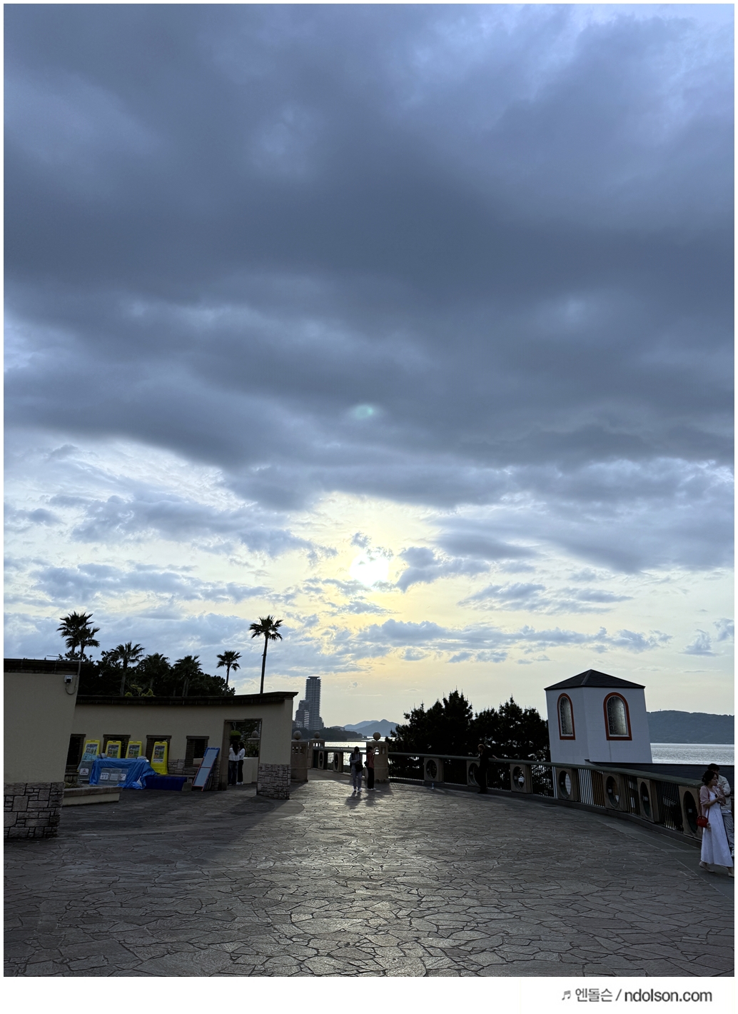 해변 쪽으로 향하니 아름다운 예식장이 눈에 들어왔습니다. 실제로 보면 더 아름다워서 계속 눈길이 갔어요. 여기서 사진을 50장은 남긴 것 같아요. 결혼식장이 잘 보이는 오른쪽 해변으로 많이 가시지만, 결혼식장 기준 왼쪽 해변도 아름다워 보였어요. 이쪽 해변은 훨씬 더 조용해 보였으니 사람 많은 게 싫으신 분들께 추천드려요.