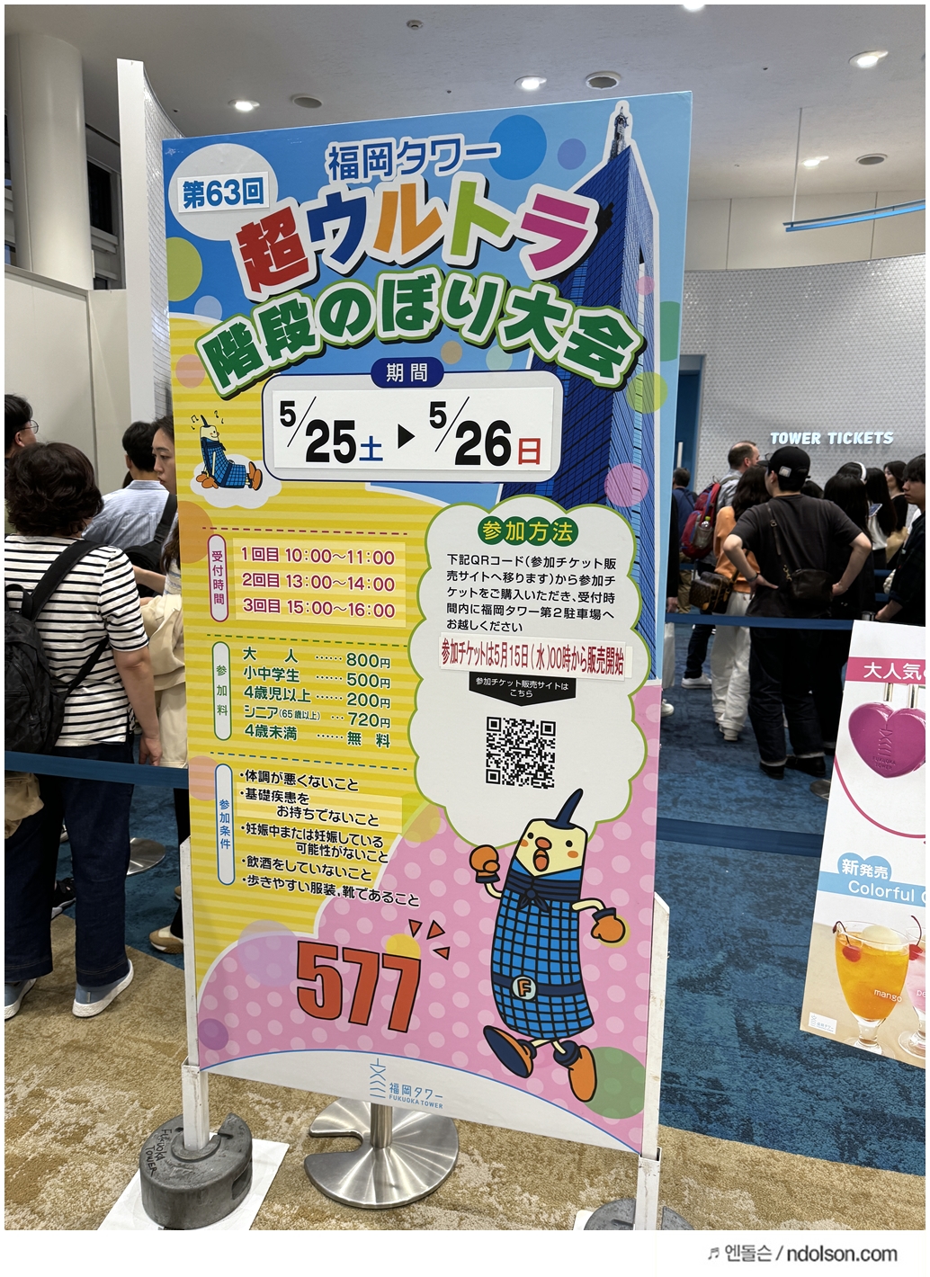후쿠오카 타워는 577개 계단이 있나 봐요. 걸어서 올라가기 대회를 하나 봐요.