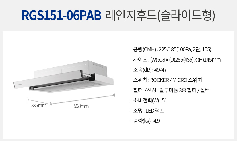 경동나비엔 슬림형 환풍기 가정용 주방 레인지 실버 슬라이드 후드 후황 600장용 / RGS151-06PA - 주