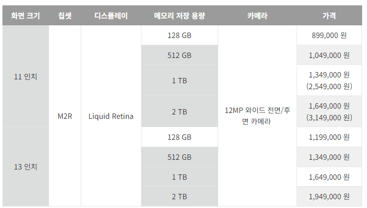 - 가격: 149만 9000원부터 (11인치), 199만 9000원부터 (13인치)