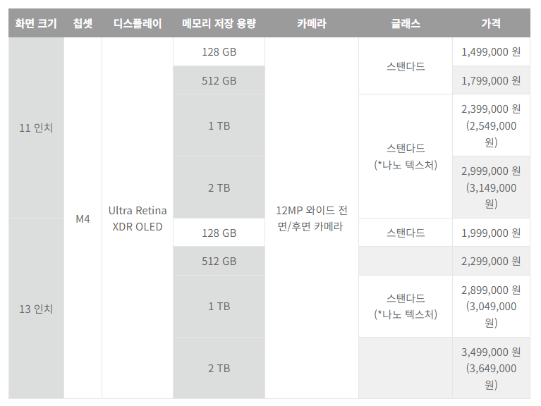 2024년형 아이패드 프로 (M4) 스펙, 가격
