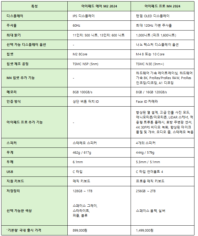 2024년형 아이패드 에어와 아이패드 프로는 애플의 태블릿 제품군 중에서도 뛰어난 성능과 특징을 자랑합니다. 각각 고급형과 전문가용 모델로 분류가 됩니다. 그래서 애플 사용자들에게 최신 기술과 강력한 기능을 제공합니다.