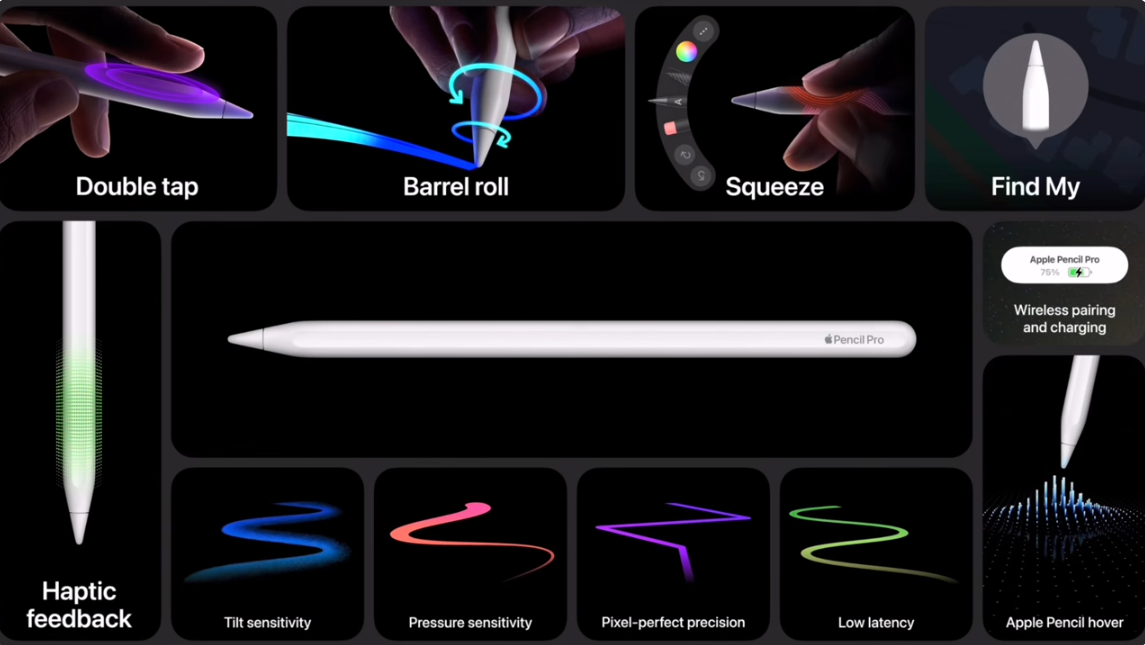 - 애플 펜슬 프로: 더블 탭 기능에 더해 배럴 롤 기능, 햅틱 피드백, 'Find My' 지원 등 추가 기능이 탑재되어 있습니다.