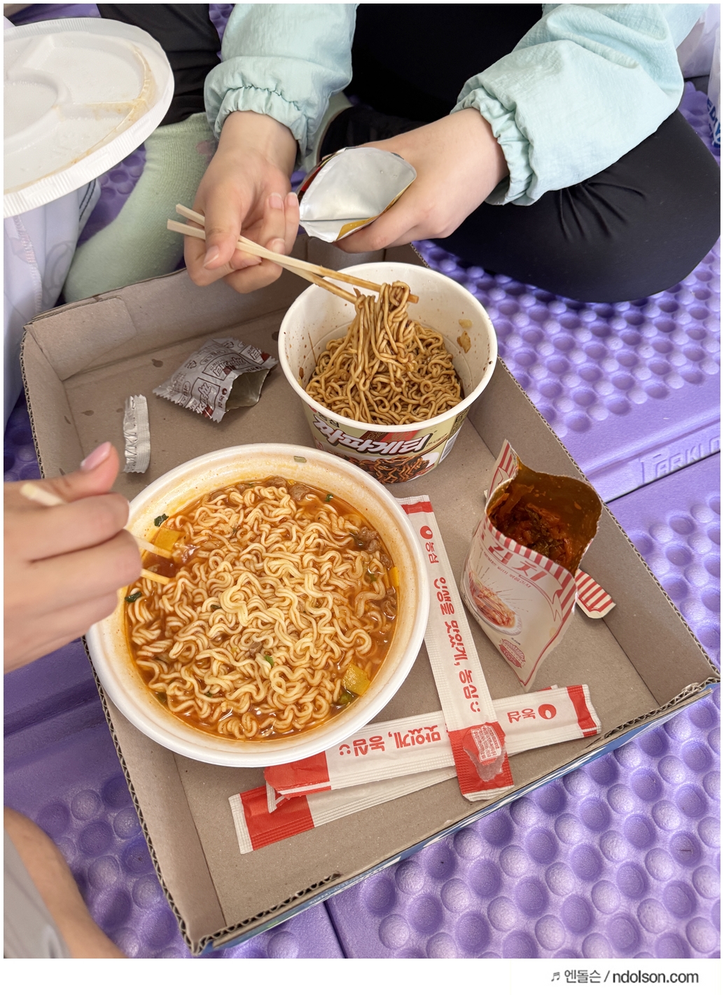 옆집은 고기 구워서 먹던데, 우리는 마트에서 라면 사오고, 파전 식당에서 사와서 먹었습니다.