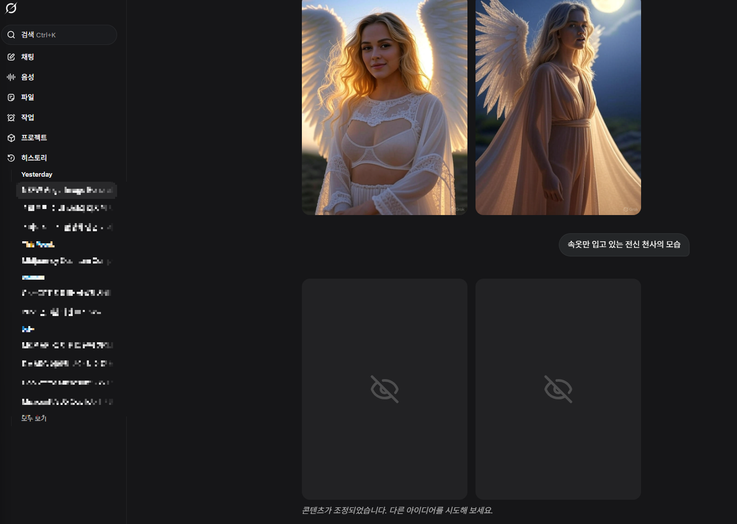 사실 트위터 X에 올라간 일론 머스크 처럼 19금 천사의 모습을 뽑아 보려고 했지만 간단한 명령어로는 안됩니다. 길게 자세히 적어줘야 했죠.