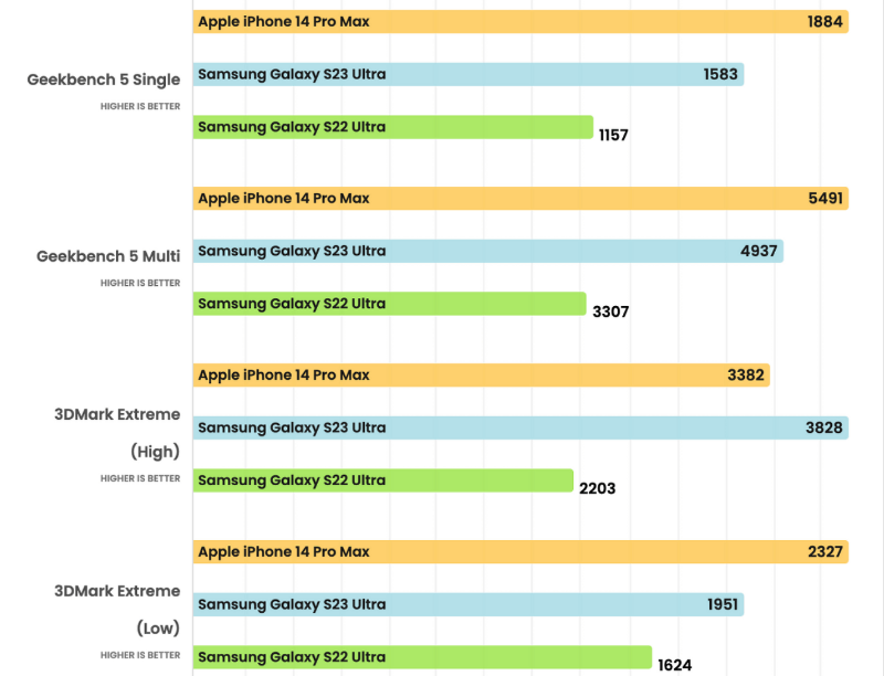 갤럭시S23 울트라와 아이폰 14 프로맥스의 카메라는 스펙과 화질, 화소면에서 차이가 큽니다. 아이폰14 시리즈는 A16 Bionic 가 삼성 갤럭시S23 시리즈는 Snapdragon 8+ Gen2 칩셋보다 성능이 더 앞선 지표를 나타냅니다. 둘다 휼륭한 AP이지만, 긱벤치 AP 테스트만으로는 결과가 갈리는군요.