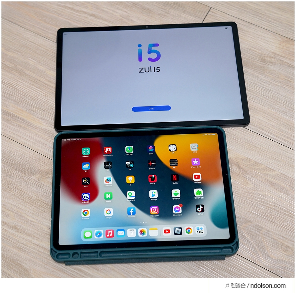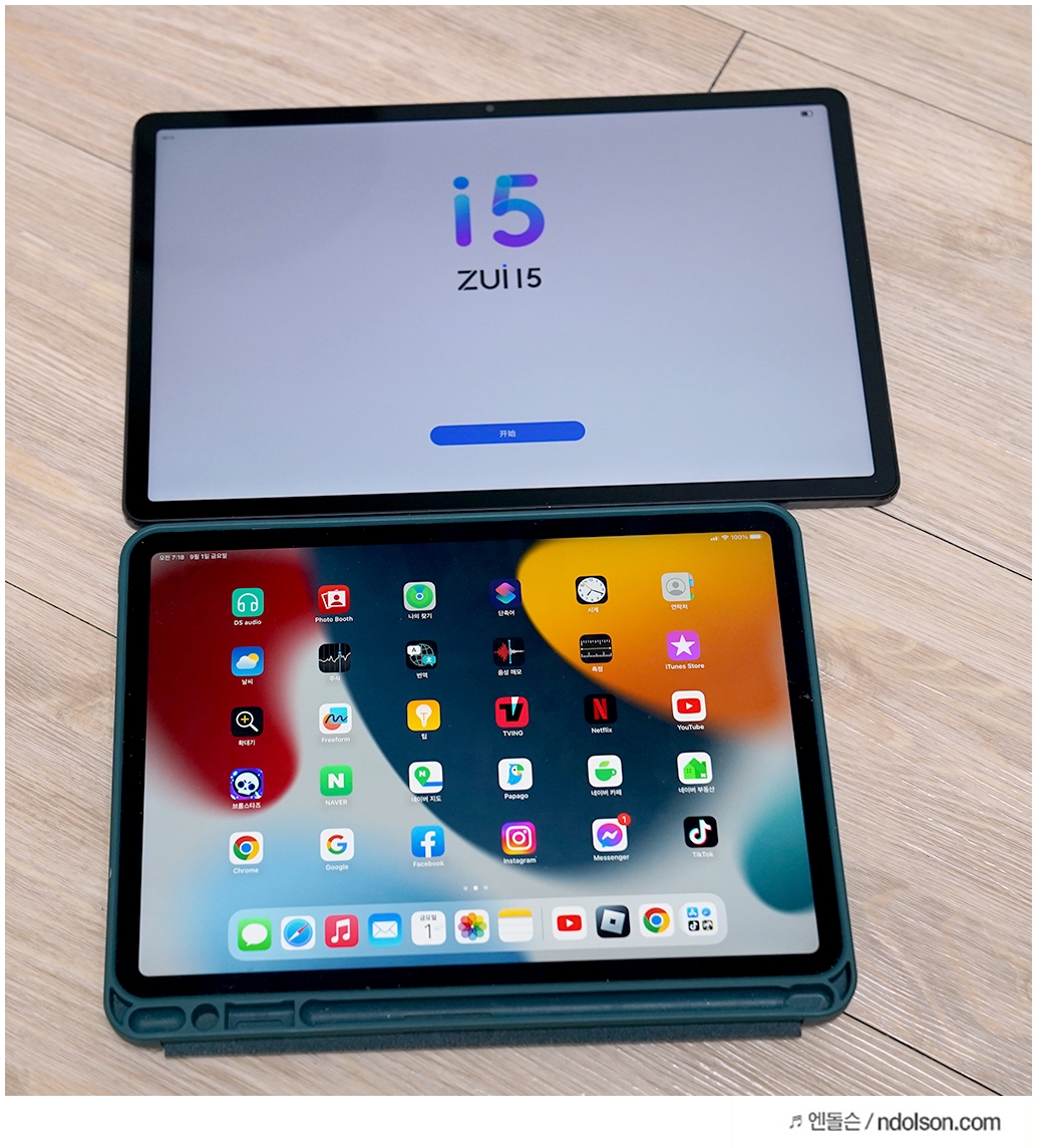 아이패드 프로 11인치와 레노버 샤오신패드 프로 12.7인치와 비교한 모습입니다. 화면의 크기가 가늠되시죠? 엄청 큽니다.