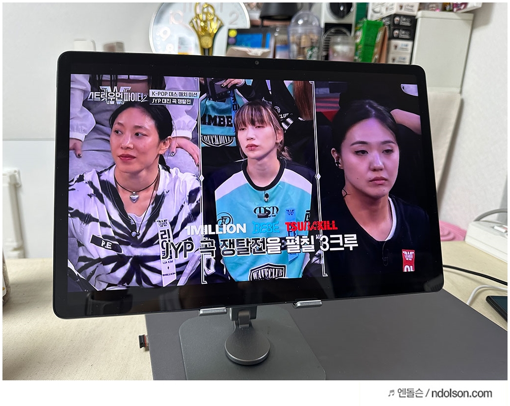 요즘 가장 핫한 프로그램 중 하나인 Mnet의 '스트릿 우먼 파이터 2'를 거실에서 편안하게 보고 있습니다. 거실에 동영상 머신이 바로 레노버 12.7인치 샤오신 태블릿입니다.