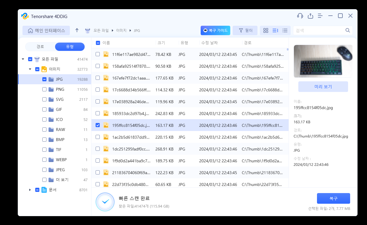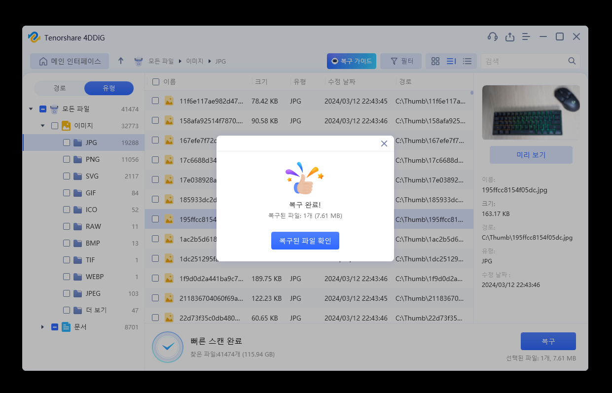 정말 빠르게 삭제된 파일을 외장 하드디스크에서 찾았습니다. 파일을 복구할 때는 파일 유형별로 찾거나 필터를 통해서 날짜별로 찾으면 더 편리합니다. 선택한 파일을 체크하고 복구를 누르면 원하는 저장 위치에 파일이 복구됩니다.