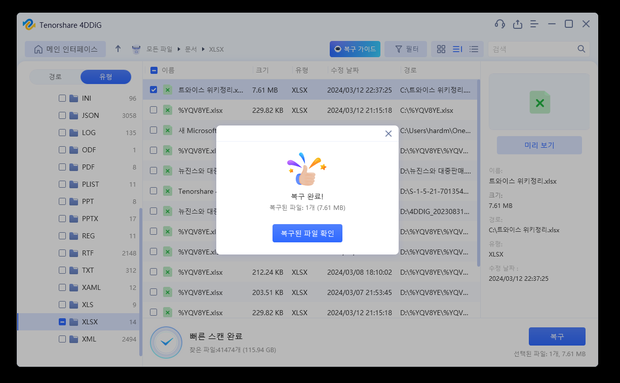 삭제한 엑셀 파일을 복구할 수 있게 스캔하였네요!!