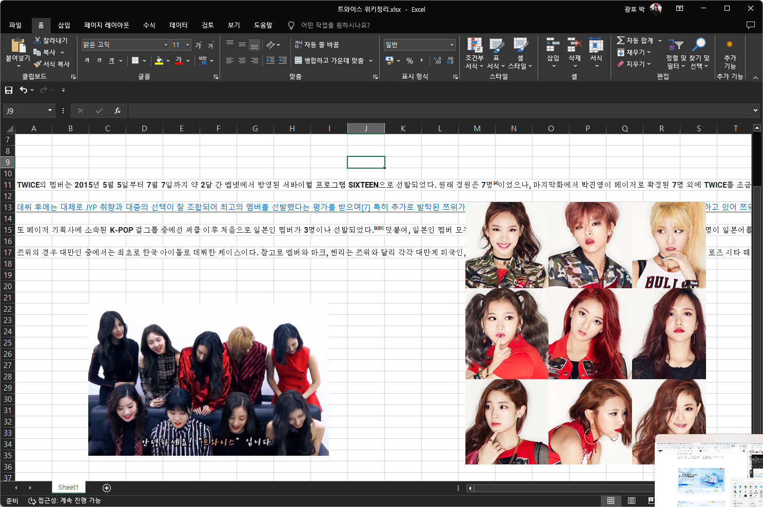 엑셀 파일이 있습니다. 트와이스 사진과 관련 내용으로 채워 두었습니다.