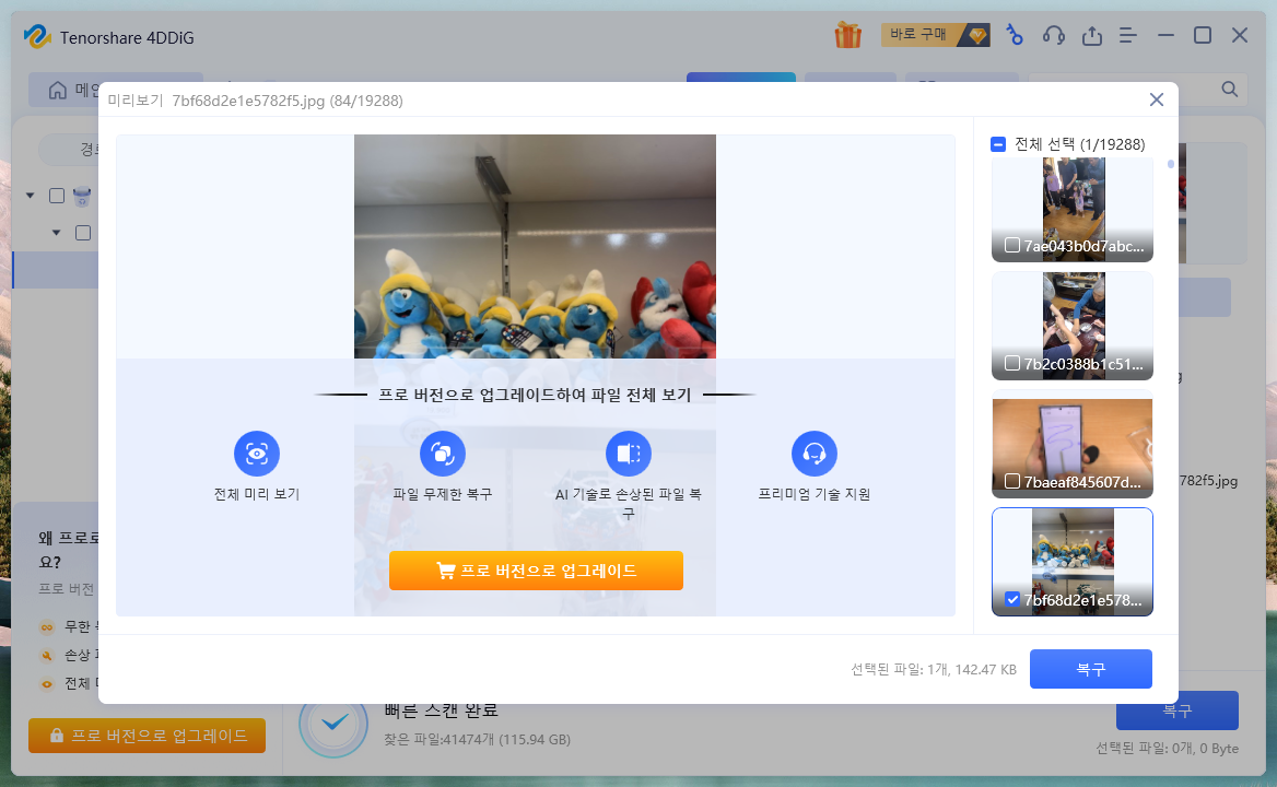 사진, 동영상 등도 일부 가려지거나 워터마크는 있지만, 미리 보기로 파일 복구 가능한 상태인지 알 수 있습니다.