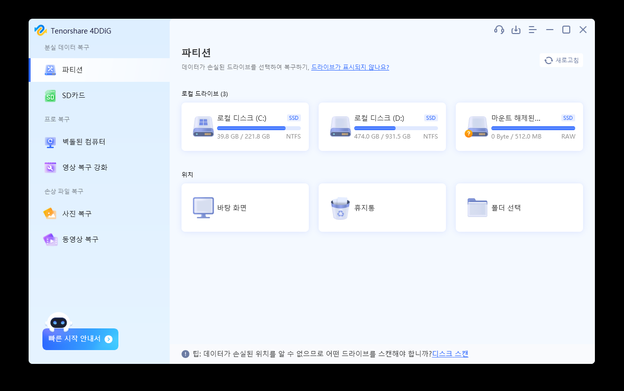Tenorshare 4DDiG Windows 데이터 복구를 다운로드하여 하드 드라이브, SD 카드, USB, 분실된 파티션 등에서 데이터를 복구하세요. 워드, 엑셀, 사진, 영상 등 2000개 이상의 파일 유형을 복구할 수 있습니
