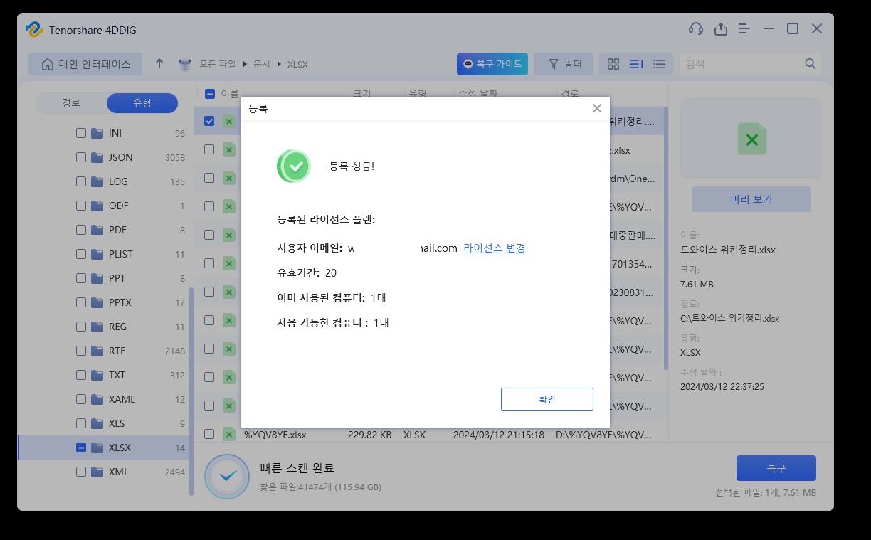 이제 삭제 파일 복구 프로그램인 4DDiG을 정품 인증 후, 복구해 보겠습니다.