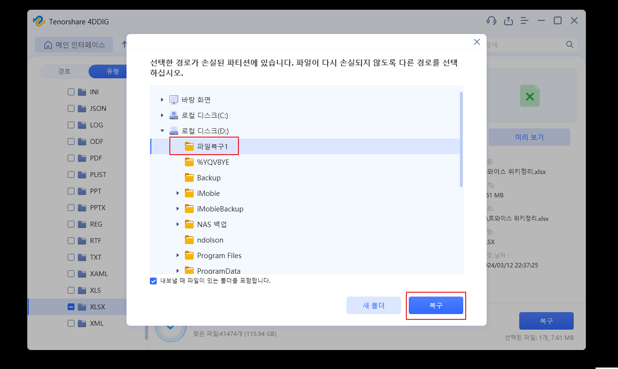 복구 파일이 저장될 경로를 지정하고 복구를 해줍니다.